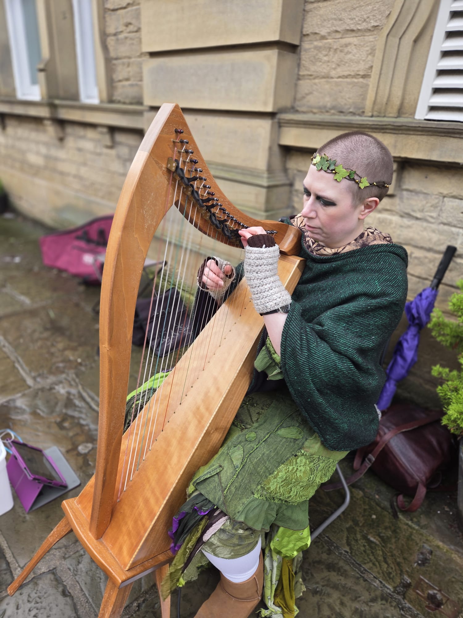 I’m Frances, a lever harp player from Leeds who can usually be found busking in the ancient market town of Skipton.